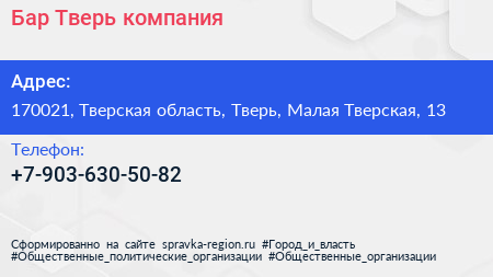 Бар-Тверь, компания по адресу 170021, Тверская область, Тверь, Малая Тверская, 13 в дальнейшем Организация, размещена в следующих категориях: