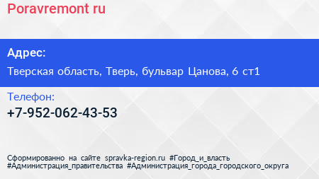 Poravremont.ru по адресу Тверская область, Тверь, бульвар Цанова, 6 ст1 в дальнейшем Организация, размещена в следующих категориях: