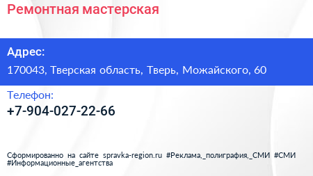 Ремонтная мастерская по адресу 170043, Тверская область, Тверь, Можайского, 60 в дальнейшем Организация, размещена в следующих категориях: