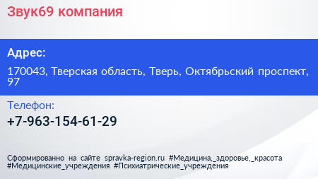 Звук69, компания по адресу 170043, Тверская область, Тверь, Октябрьский проспект, 97 в дальнейшем Организация, размещена в следующих категориях: