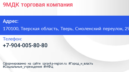 9МДК, торговая компания по адресу 170100, Тверская область, Тверь, Смоленский переулок, 29 в дальнейшем Организация, размещена в следующих категориях: