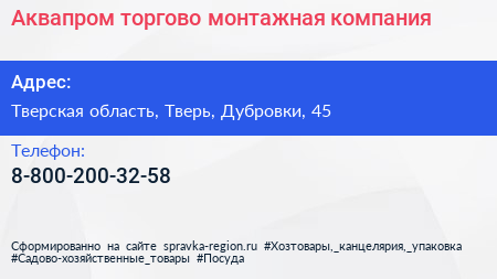 Аквапром, торгово-монтажная компания по адресу Тверская область, Тверь, Дубровки, 45 в дальнейшем Организация, размещена в следующих категориях:
