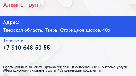 Альянс Групп по адресу Тверская область, Тверь, Старицкое шоссе, 40а в дальнейшем Организация, размещена в следующих категориях: