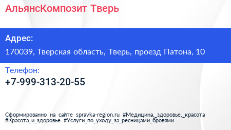 АльянсКомпозит Тверь по адресу 170039, Тверская область, Тверь, проезд Патона, 10 в дальнейшем Организация, размещена в следующих категориях: