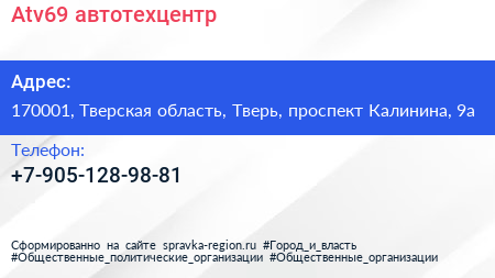 Atv69, автотехцентр по адресу 170001, Тверская область, Тверь, проспект Калинина, 9а в дальнейшем Организация, размещена в следующих категориях: