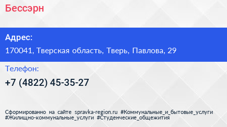 Бессэрн по адресу 170041, Тверская область, Тверь, Павлова, 29 в дальнейшем Организация, размещена в следующих категориях: