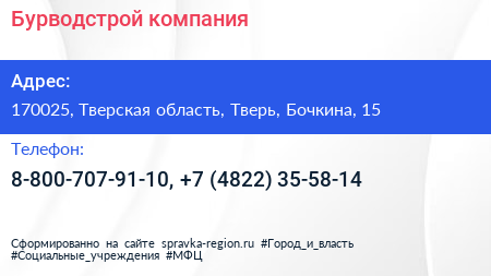Бурводстрой, компания по адресу 170025, Тверская область, Тверь, Бочкина, 15 в дальнейшем Организация, размещена в следующих категориях: