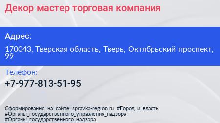 Декор мастер, торговая компания по адресу 170043, Тверская область, Тверь, Октябрьский проспект, 99 в дальнейшем Организация, размещена в следующих категориях: