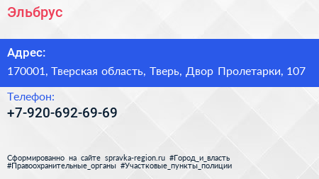 Эльбрус по адресу 170001, Тверская область, Тверь, Двор Пролетарки, 107 в дальнейшем Организация, размещена в следующих категориях:
