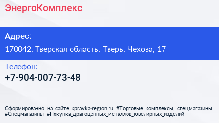 ЭнергоКомплекс по адресу 170042, Тверская область, Тверь, Чехова, 17 в дальнейшем Организация, размещена в следующих категориях:
