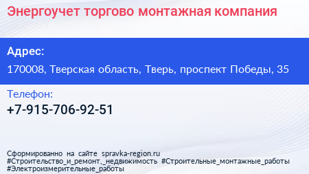 Энергоучет, торгово-монтажная компания по адресу 170008, Тверская область, Тверь, проспект Победы, 35 в дальнейшем Организация, размещена в следующих категориях: