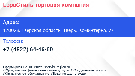 ЕвроСтиль, торговая компания по адресу 170028, Тверская область, Тверь, Коминтерна, 97 в дальнейшем Организация, размещена в следующих категориях: