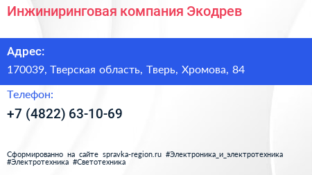 Инжиниринговая компания Экодрев по адресу 170039, Тверская область, Тверь, Хромова, 84 в дальнейшем Организация, размещена в следующих категориях: