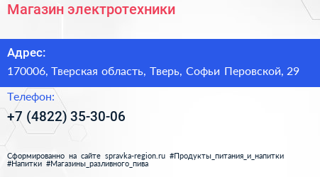 Магазин электротехники по адресу 170006, Тверская область, Тверь, Софьи Перовской, 29 в дальнейшем Организация, размещена в следующих категориях: