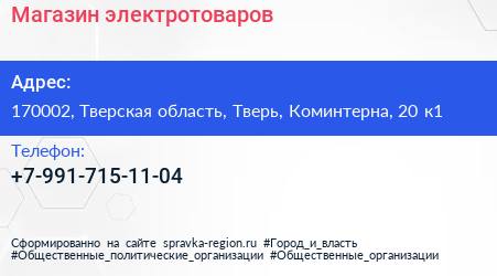 Магазин электротоваров по адресу 170002, Тверская область, Тверь, Коминтерна, 20 к1 в дальнейшем Организация, размещена в следующих категориях: