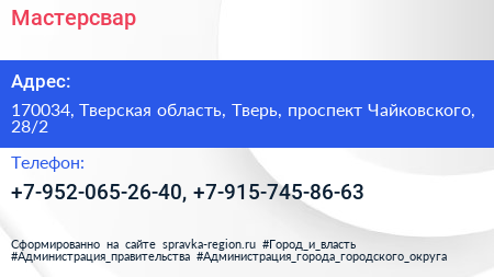 Мастерсвар по адресу 170034, Тверская область, Тверь, проспект Чайковского, 28/2 в дальнейшем Организация, размещена в следующих категориях: