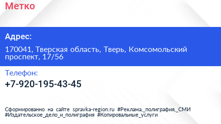 Метко по адресу 170041, Тверская область, Тверь, Комсомольский проспект, 17/56 в дальнейшем Организация, размещена в следующих категориях: