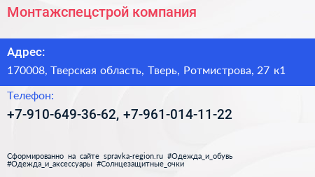 Монтажспецстрой, компания по адресу 170008, Тверская область, Тверь, Ротмистрова, 27 к1 в дальнейшем Организация, размещена в следующих категориях: