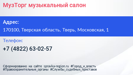 МузТорг, музыкальный салон по адресу 170100, Тверская область, Тверь, Московская, 1 в дальнейшем Организация, размещена в следующих категориях: