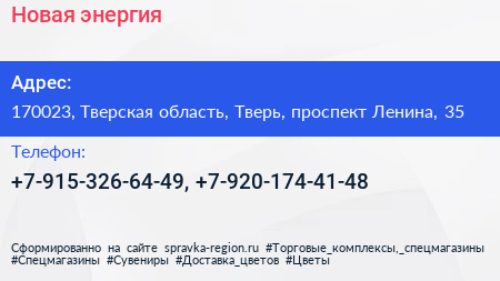 Новая энергия по адресу 170023, Тверская область, Тверь, проспект Ленина, 35 в дальнейшем Организация, размещена в следующих категориях: