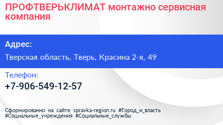ПРОФТВЕРЬКЛИМАТ, монтажно-сервисная компания по адресу Тверская область, Тверь, Красина 2-я, 49 в дальнейшем Организация, размещена в следующих категориях: