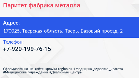 Паритет, фабрика металла по адресу 170025, Тверская область, Тверь, Базовый проезд, 2 в дальнейшем Организация, размещена в следующих категориях: