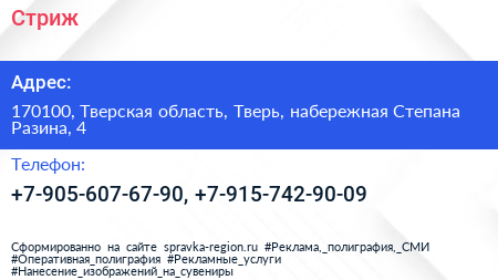 Стриж по адресу 170100, Тверская область, Тверь, набережная Степана Разина, 4 в дальнейшем Организация, размещена в следующих категориях:
