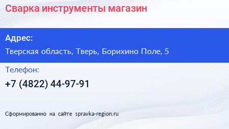 Сварка инструменты, магазин по адресу Тверская область, Тверь, Борихино Поле, 5 в дальнейшем Организация, размещена в следующих категориях: