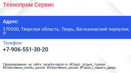 Технопром Сервис по адресу 170100, Тверская область, Тверь, Вагжановский переулок, 9 в дальнейшем Организация, размещена в следующих категориях: