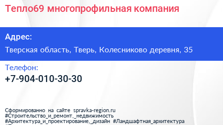 Тепло69, многопрофильная компания по адресу Тверская область, Тверь, Колесниково деревня, 35 в дальнейшем Организация, размещена в следующих категориях:
