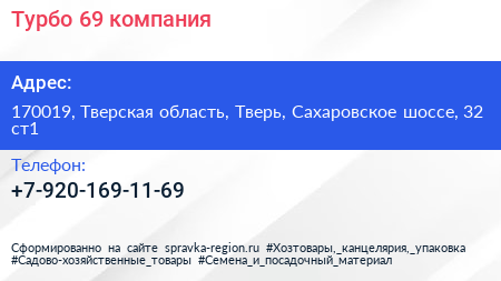 Турбо 69, компания по адресу 170019, Тверская область, Тверь, Сахаровское шоссе, 32 ст1 в дальнейшем Организация, размещена в следующих категориях: