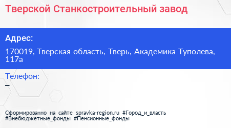 Тверской Станкостроительный завод по адресу 170019, Тверская область, Тверь, Академика Туполева, 117а в дальнейшем Организация, размещена в следующих категориях: