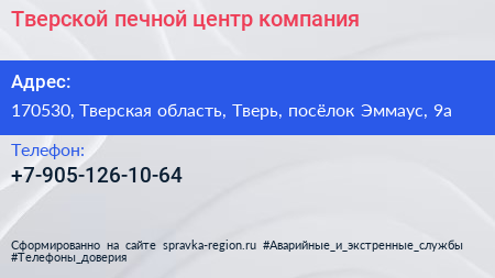 Тверской печной центр, компания по адресу 170530, Тверская область, Тверь, посёлок Эммаус, 9а в дальнейшем Организация, размещена в следующих категориях: