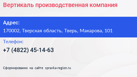 Вертикаль, производственная компания по адресу 170002, Тверская область, Тверь, Макарова, 101 в дальнейшем Организация, размещена в следующих категориях: