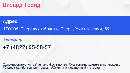Визард-Трейд по адресу 170006, Тверская область, Тверь, Учительская, 59 в дальнейшем Организация, размещена в следующих категориях: