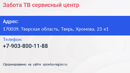 Забота-ТВ, сервисный центр по адресу 170039, Тверская область, Тверь, Хромова, 23 к1 в дальнейшем Организация, размещена в следующих категориях: