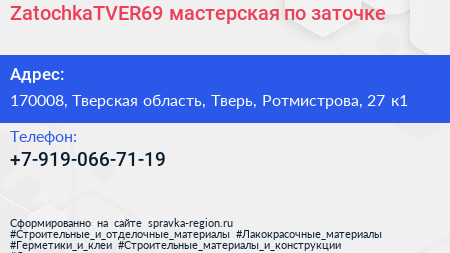 ZatochkaTVER69, мастерская по заточке по адресу 170008, Тверская область, Тверь, Ротмистрова, 27 к1 в дальнейшем Организация, размещена в следующих категориях:
