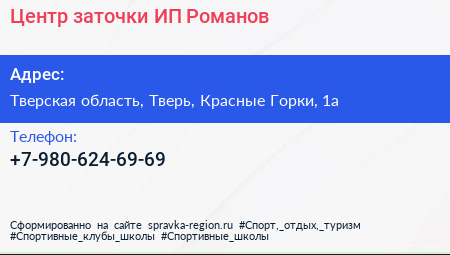 Центр заточки, ИП Романов по адресу Тверская область, Тверь, Красные Горки, 1а в дальнейшем Организация, размещена в следующих категориях: