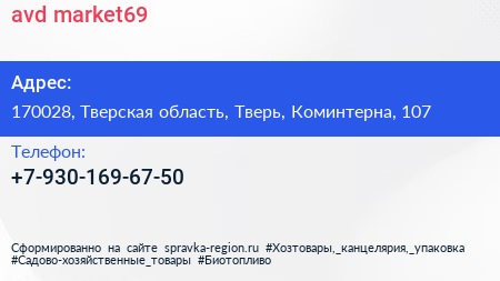 avd-market69 по адресу 170028, Тверская область, Тверь, Коминтерна, 107 в дальнейшем Организация, размещена в следующих категориях: