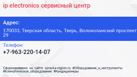 ip-electronics, сервисный центр по адресу 170033, Тверская область, Тверь, Волоколамский проспект, 29 в дальнейшем Организация, размещена в следующих категориях: