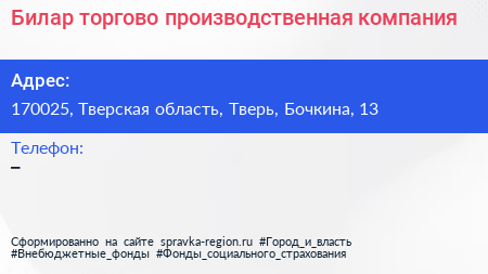 Билар, торгово-производственная компания по адресу 170025, Тверская область, Тверь, Бочкина, 13 в дальнейшем Организация, размещена в следующих категориях:
