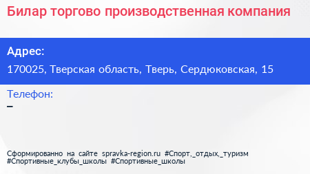 Билар, торгово-производственная компания по адресу 170025, Тверская область, Тверь, Сердюковская, 15 в дальнейшем Организация, размещена в следующих категориях: