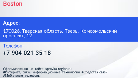 Boston по адресу 170026, Тверская область, Тверь, Комсомольский проспект, 12 в дальнейшем Организация, размещена в следующих категориях: