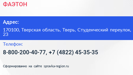 ФАЭТОН по адресу 170100, Тверская область, Тверь, Студенческий переулок, 23 в дальнейшем Организация, размещена в следующих категориях: