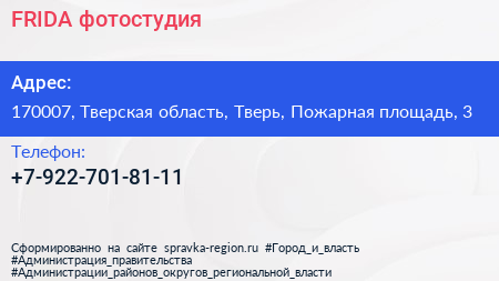 FRIDA, фотостудия по адресу 170007, Тверская область, Тверь, Пожарная площадь, 3 в дальнейшем Организация, размещена в следующих категориях: