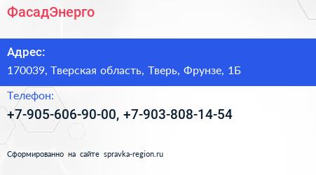 ФасадЭнерго по адресу 170039, Тверская область, Тверь, Фрунзе, 1Б в дальнейшем Организация, размещена в следующих категориях: