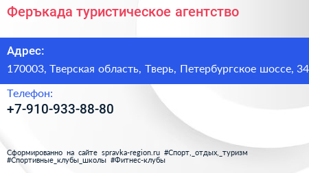 Феръкада, туристическое агентство по адресу 170003, Тверская область, Тверь, Петербургское шоссе, 34 в дальнейшем Организация, размещена в следующих категориях:
