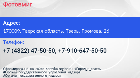 Фотовмиг по адресу 170009, Тверская область, Тверь, Громова, 26 в дальнейшем Организация, размещена в следующих категориях: