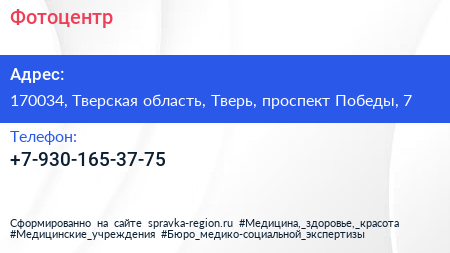 Фотоцентр по адресу 170034, Тверская область, Тверь, проспект Победы, 7 в дальнейшем Организация, размещена в следующих категориях: