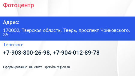 Фотоцентр по адресу 170002, Тверская область, Тверь, проспект Чайковского, 35 в дальнейшем Организация, размещена в следующих категориях: